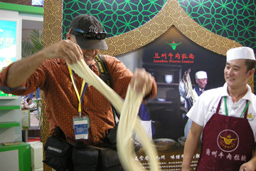 圖為各級領(lǐng)導(dǎo)、觀眾及參展商圍觀公司拉面師傅現(xiàn)場表演蘭州牛肉拉面