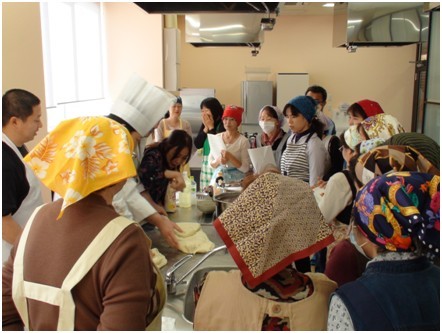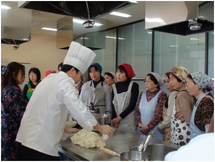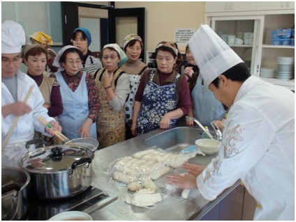 甘肅金味餐飲有限公司總經(jīng)理、蘭州市烹飪技術(shù)協(xié)會(huì)副會(huì)長(zhǎng)梁順儉先生向日本秋田市民傳授蘭州拉面文化。