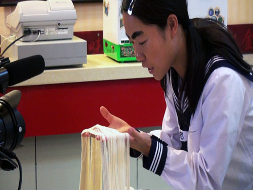 此情此景,伊毛島小姐不敢相信自己的眼睛,反復(fù)挑起“面絲”和自己頭發(fā)作比較,并感嘆“我們?nèi)ツ昕吹竭^您在日本秋田市傳播蘭州牛肉拉面文化時的報道,覺得很不可思議。一團(tuán)面怎么就可以拉出像頭發(fā)絲粗細(xì)的面條呢?所以今天我們特意從日本趕來,想親眼目睹奇跡是怎樣在您手上誕生的!