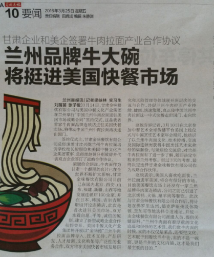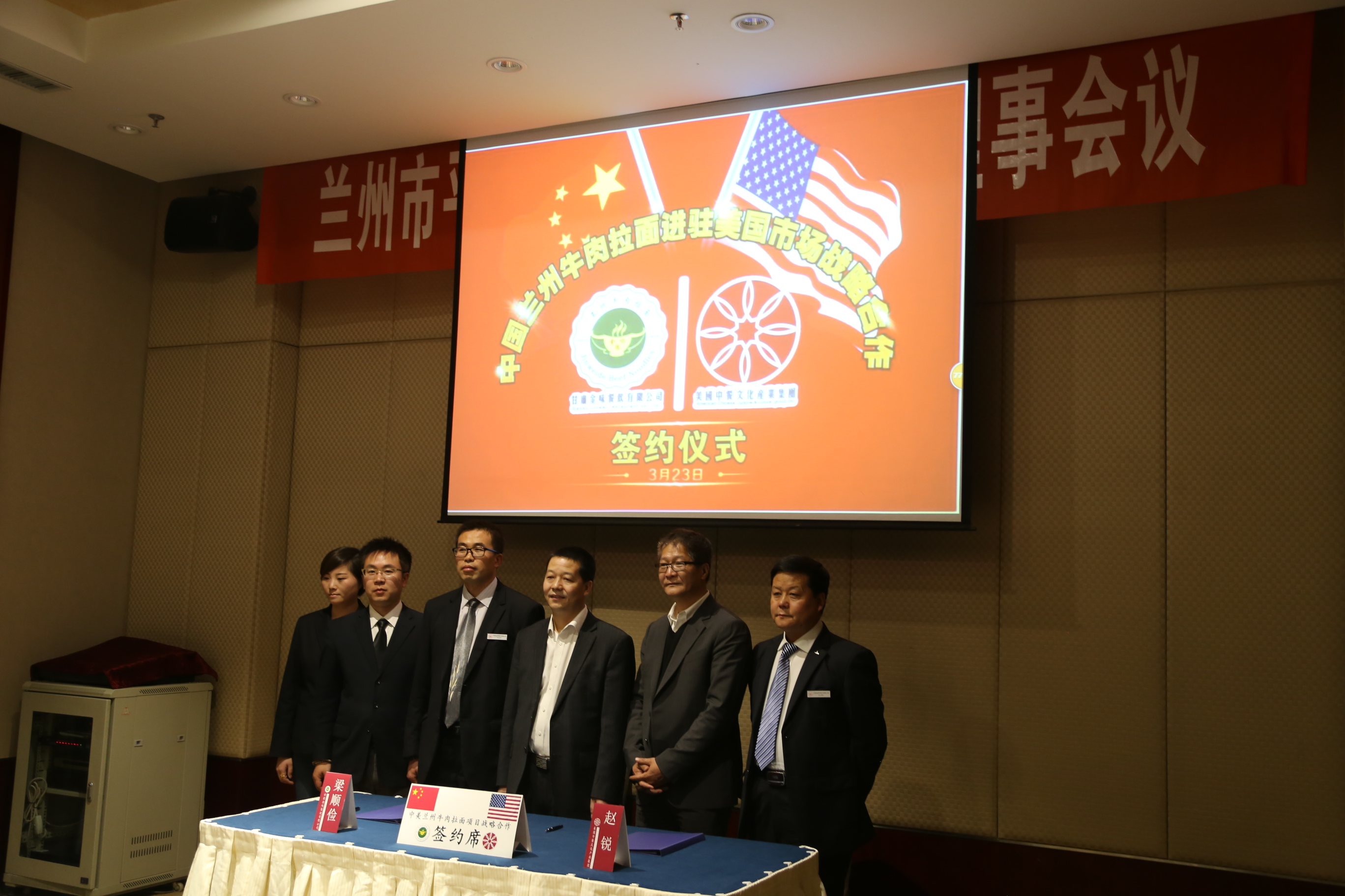 帶動(dòng)中國(guó)蘭州牛肉拉面走出國(guó)門(mén),走向世界,實(shí)現(xiàn)中美兩國(guó)餐飲企業(yè)跨越式發(fā)展在金城蘭州舉行了隆重的“中國(guó)蘭州牛肉拉面進(jìn)駐美國(guó)市場(chǎng)戰(zhàn)略合同”簽約儀式。