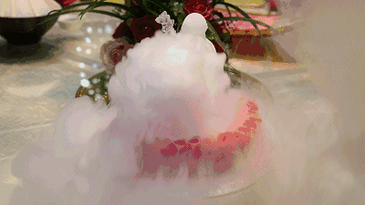 又如一尊皇牛的祥云刺身,點(diǎn)擊率達(dá)到60%,不僅口感好,而且造型獨(dú)特有多個(gè)版本,天鵝版是這樣的:薄牛肉片放碎冰上疊成牡丹花狀,旁邊是天鵝冰雕和鮮花枝,當(dāng)服務(wù)員把澆開水澆在冰塊上,瞬間這道菜四周冒起了煙霧,像天鵝飛過霧氣彌漫的湖面,非常夢(mèng)幻。下圖是神仙版: