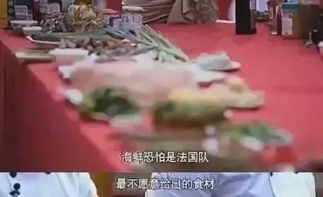 這次是中國大師傅先挑選。當中國大師傅還在凝神細思時,旁白賤賤地來了一句:海鮮恐怕是法國隊最不愿意拿出的食材……