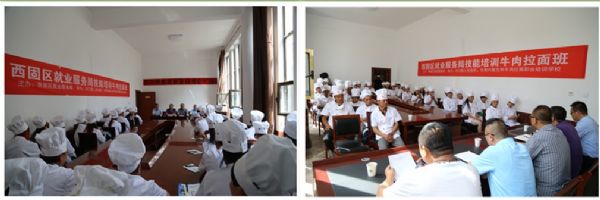 西固區(qū)就業(yè)服務(wù)局局長王海龍、河口鎮(zhèn)政府黨委書記黃建國、副書記楊世鵬、西固區(qū)就業(yè)服務(wù)局培訓(xùn)科主任薜會斌、甘肅興隴蘭州牛肉拉面職業(yè)培訓(xùn)學(xué)校副校長張桂梅以及河口鎮(zhèn)河口村經(jīng)營戶和富余勞動力等60多人參加了此次開班儀式。