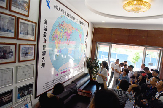 全國網(wǎng)媒記者在一張標記滿小紅旗的世界地圖前駐足觀看,地圖上,凡是有小紅旗標記的位置,都遍布金味德牛肉面。