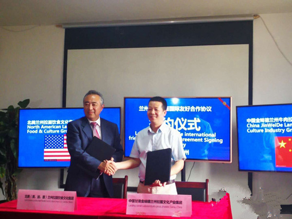 在6月23日開幕的2018中國面條博覽會上,梁順儉將自己研究開發(fā)出一款不使用篷灰和拉面劑的原生態(tài)拉面現(xiàn)場表演,并面向全球的牛肉拉面企業(yè)及牛肉拉面師進(jìn)行公開培訓(xùn)。 7月4日,前來參加第24屆蘭洽會的新西蘭中國國際貿(mào)易促進(jìn)委員會與中國蘭州金味德拉面文化產(chǎn)業(yè)集團(tuán)簽訂合作協(xié)議。根據(jù)協(xié)議,蘭州牛肉面及其培訓(xùn)學(xué)校將同時首次進(jìn)駐新西蘭市場,首家門店將于8月份在新西蘭奧克蘭市開張迎客。而在此前的6月24日,參加2018中國面條博覽會的美國南加州華人華僑商會會長應(yīng)持榮同中國蘭州金味德牛肉面文化產(chǎn)業(yè)集團(tuán)董事長梁順儉簽訂合作協(xié)議。雙方約定,今年計(jì)劃在美國、加拿大、墨西哥等三國各開設(shè)一家蘭州金味德牛肉面分店。未來將在北美開設(shè)百家分店,把蘭州牛肉面餐飲及文化傳播出去。