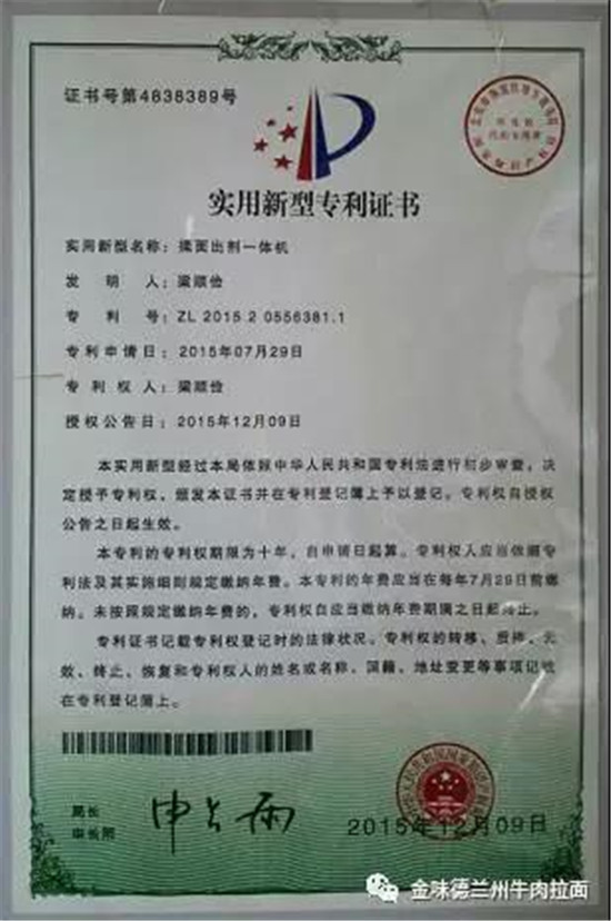 近年來(lái),蘭州牛肉面產(chǎn)業(yè)化發(fā)展被提上了日程,備受矚目。然而,產(chǎn)業(yè)化發(fā)展,必須實(shí)現(xiàn)機(jī)械化。正當(dāng)牛肉面人為之發(fā)愁的時(shí)候,中國(guó)烹飪大師、甘肅興隴蘭州牛肉拉面職業(yè)培訓(xùn)學(xué)校校長(zhǎng)梁順儉率先邁出了第一步,研究發(fā)明出了“興隴”揉面出劑一體機(jī),這是蘭州拉面史上一次全新的嘗試與改革,將極大推動(dòng)蘭州牛肉面的發(fā)展。 揉面出劑一體機(jī)專利證書