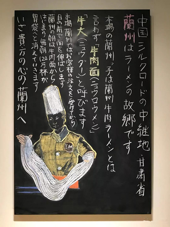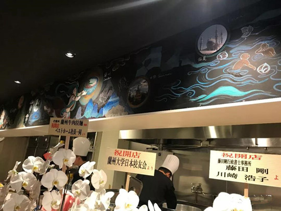 據(jù)“老蘭州”蘭州牛肉面店長(zhǎng)楊勇奇先生介紹,“老蘭州”牛肉面店開張,最初的想法是為了圓在日本從小吃牛肉面長(zhǎng)大的蘭州人的一個(gè)夢(mèng)想,為在日華人及日本客人提供正宗的蘭州牛肉面,所有面條都是由店內(nèi)的師傅手工拉成,比如在菜單上有款叫“肉蛋雙飛”的牛肉面,這款牛肉面不是在蘭州生活過的人基本上不會(huì)知道。經(jīng)營模式上不釆用純商業(yè)運(yùn)作,而是將老味道、古文化、純鄉(xiāng)情融入到每一碗牛肉面中,讓在日本的蘭州人感覺到家的味道,并邀請(qǐng)?jiān)谌杖A人敦煌研究家張?jiān)粗蠋熡昧艘粋(gè)多星期的時(shí)間,將甘肅從敦煌到天水間的名勝,用八米長(zhǎng)的壁畫形式展示在店內(nèi)的墻壁上,讓來店的每一位體驗(yàn)到敦煌文化的博大精深。