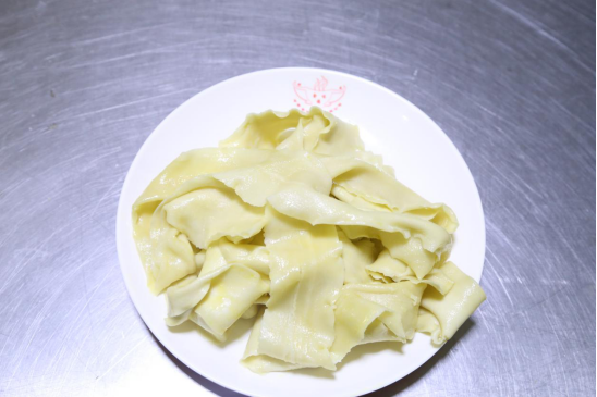 2、韭葉扁形面條,韭菜葉的形狀,寬約4~5mm,一般六手成型。溫潤透明,纖薄而不粘連?诟芯鼷,為喜愛扁形面條的食客所喜愛。