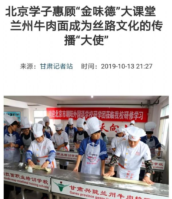 蘭州牛肉拉面享譽世界,10月12-13日兩天,來自北京朝陽外國語學校的400多名師生走進蘭州金味德,感受蘭州牛肉面背后的歷史文化,探秘絲綢之路博大精深。獲得多家媒體爭相報道。