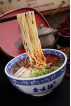 將溜好的面條放在案板上,撒上清油(以防止面條粘連),然后隨食客的愛(ài)好,拉出大小粗細(xì)不同的面條,喜食圓面條的,可以選擇粗、二細(xì)、三細(xì)、細(xì)、毛細(xì)5種款式;喜食扁面的,可以選擇大寬、寬、韭葉3種款式;想吃出個(gè)棱角分明的,拉面師傅會(huì)為你拉一碗特別的"蕎麥楞"。拉面是一手絕活,手握兩端,兩臂均勻用力加速向外抻拉,然后兩頭對(duì)折,兩頭同時(shí)放在一只手的指縫內(nèi)(一般用左手),另一只手的中指朝下勾住另一端,手心上翻,使面條形成絞索狀,同時(shí)兩手往兩邊抻拉。面條拉長(zhǎng)后,再把右手勾住的一端套在左手指上,右手繼續(xù)勾住另一端抻拉。抻拉時(shí)速度要快,用力要均勻,如此反復(fù),每次對(duì)折稱(chēng)為一扣。