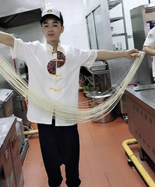 抻拉是一個(gè)技術(shù)性很強(qiáng)的工作,初學(xué)者很難掌握要領(lǐng)。同樣的面團(tuán),在有經(jīng)驗(yàn)的老廚師手中,不但拉面速度快(一般只需10秒鐘左右),且拉出的面條粗細(xì)均勻,且不斷裂,而初學(xué)者就很難做到。一個(gè)面節(jié)正好拉一大碗面,每拉一下,要在手腕上回折一次,拉到最后,雙手上下抖動(dòng)幾次,則面條柔韌綿長(zhǎng),粗細(xì)均勻。一般二細(xì)均為7扣,細(xì)的則為9扣,毛細(xì)面可以達(dá)11扣,條細(xì)如絲,且不斷裂,真可謂中國(guó)烹飪之精華。面條光滑筋道,在鍋里稍煮一下即撈出,柔韌不粘。有句順口溜形容往鍋里下面:"拉面好似一盤(pán)線(xiàn),下到鍋里悠悠轉(zhuǎn),撈到碗里菊花瓣"。觀看拉面好像是欣賞雜技表演。