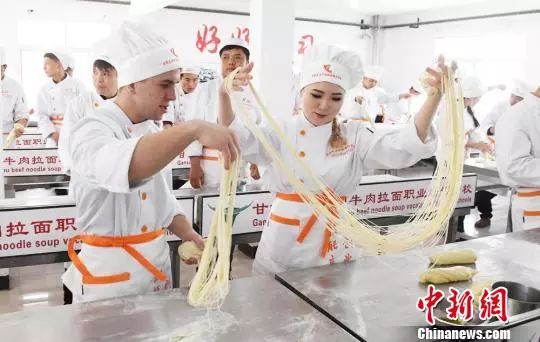 2018年4月11日,來自哈薩克斯坦、澳大利亞等國學(xué)員在蘭州學(xué)習(xí)牛肉面制作工藝。(資料圖)