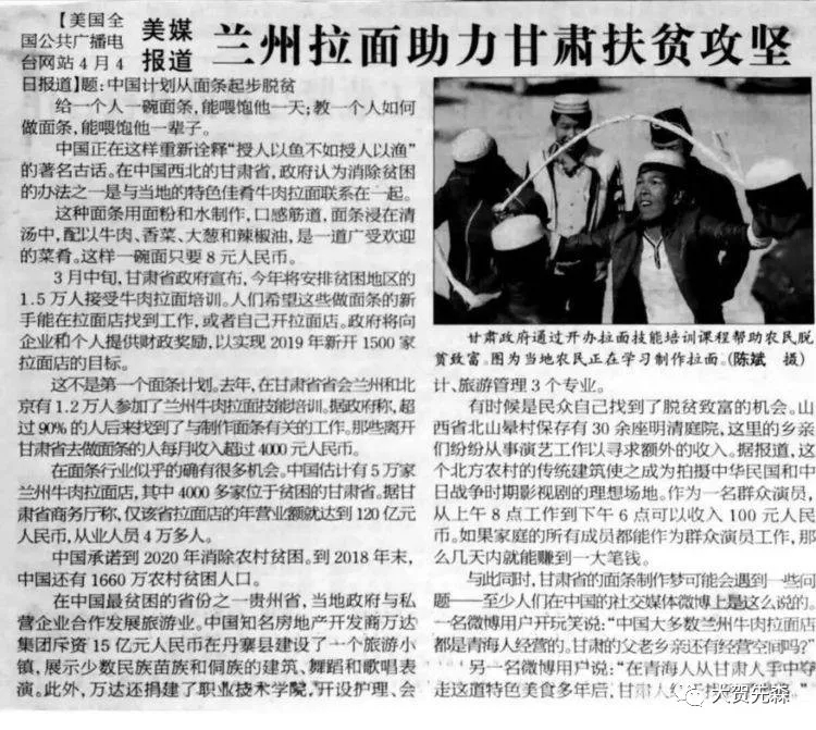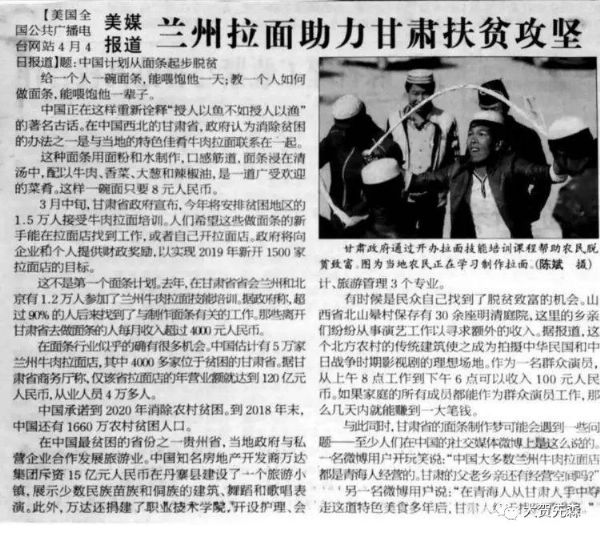 在中國西北的甘肅省,政府認為消除貧困的辦法之一是與當?shù)氐奶厣央扰H饫媛?lián)系在一起。這種面條用面粉和水制作,口感筋道,面條浸在清湯中,配以牛肉、香菜、大蔥和辣椒油,是一道廣受歡迎的菜肴。這樣一碗面只要8元人民幣。