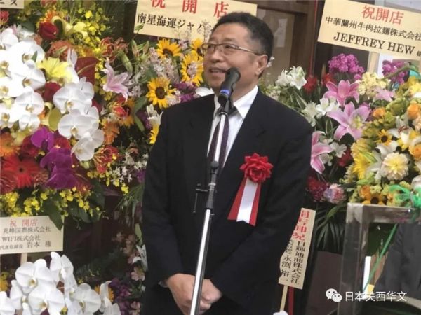 日本友好人士、日中經(jīng)貿(mào)中心常務(wù)理事池田稔也在現(xiàn)場(chǎng)發(fā)言。他先介紹了日本拉面的歷史,同時(shí)表示:“在中國(guó),面的歷史非常悠久,各類繁多,其中蘭州拉面是最有名的面,在中國(guó)在哪里都能吃到的老百姓喜歡的面之一!彼f(shuō):“在中國(guó)最有名的蘭州拉面來(lái)到神戶了,在神戶跟世界上最有名的神戶牛肉匯合,成為蘭州牛肉拉面了。這拉面是在中國(guó)、在日本或者在全世界的哪里都不能品嘗的,世界第一的蘭州神戶牛肉拉面!背靥锵壬瑫r(shí)表示:日本的很多文化習(xí)慣是從中國(guó)學(xué)過(guò)來(lái)的,現(xiàn)在日本和中國(guó)之間有多方面的合作!爸孕南M@蘭州牛肉拉面作為中國(guó)和日本的飲食文化合作的結(jié)晶,成為很多人喜歡的,許多人吃的神戶名菜!绷硪晃恢匾钨e、中國(guó)駐大阪總領(lǐng)館商務(wù)室負(fù)責(zé)人孫淑強(qiáng)也發(fā)表了講話,對(duì)神戶蘭州拉面店開(kāi)業(yè)表示熱烈祝賀。