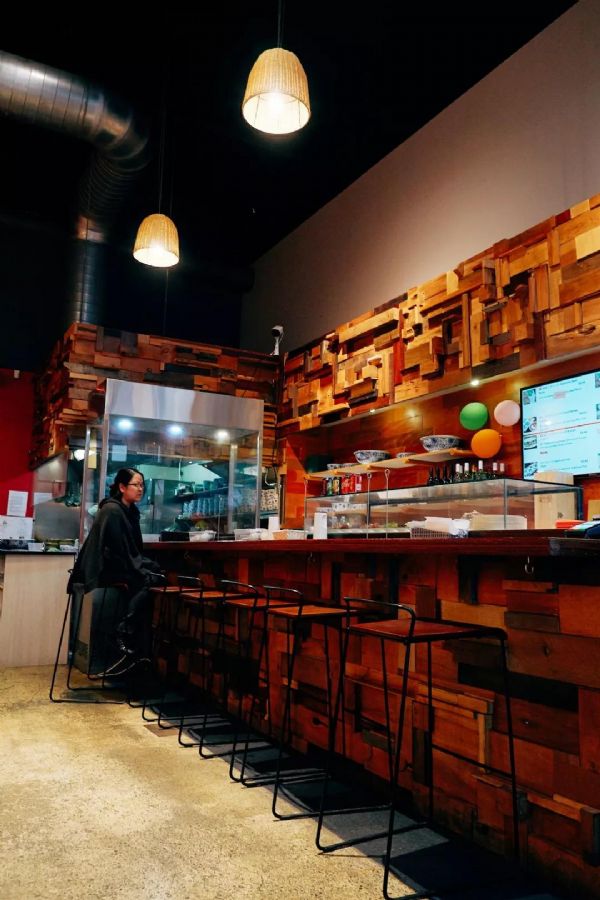 進(jìn)到店里,傳統(tǒng)與現(xiàn)代相結(jié)合的裝潢風(fēng)格令人賞心悅目。木質(zhì)桌椅、皮革沙發(fā),簡(jiǎn)潔大氣;竹制燈籠營(yíng)造出搖曳曼妙的氛圍;巨幅海報(bào)詮釋著拉面之道。