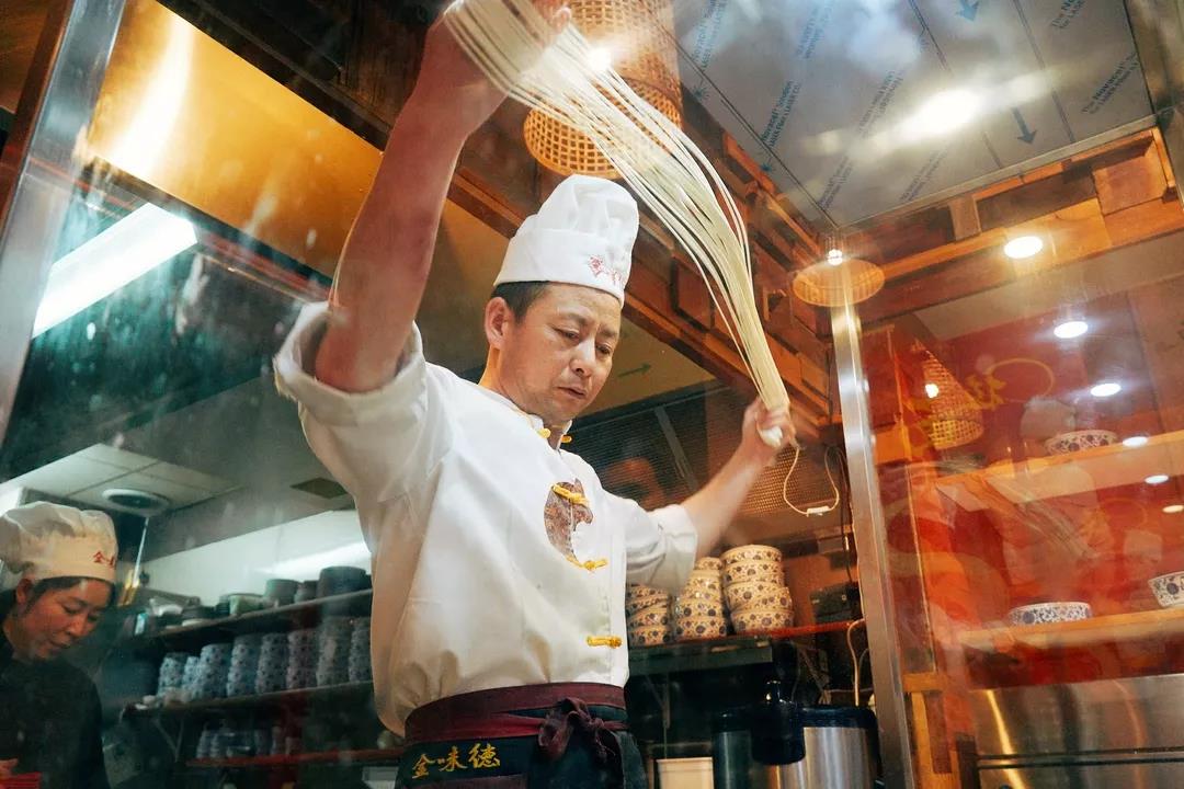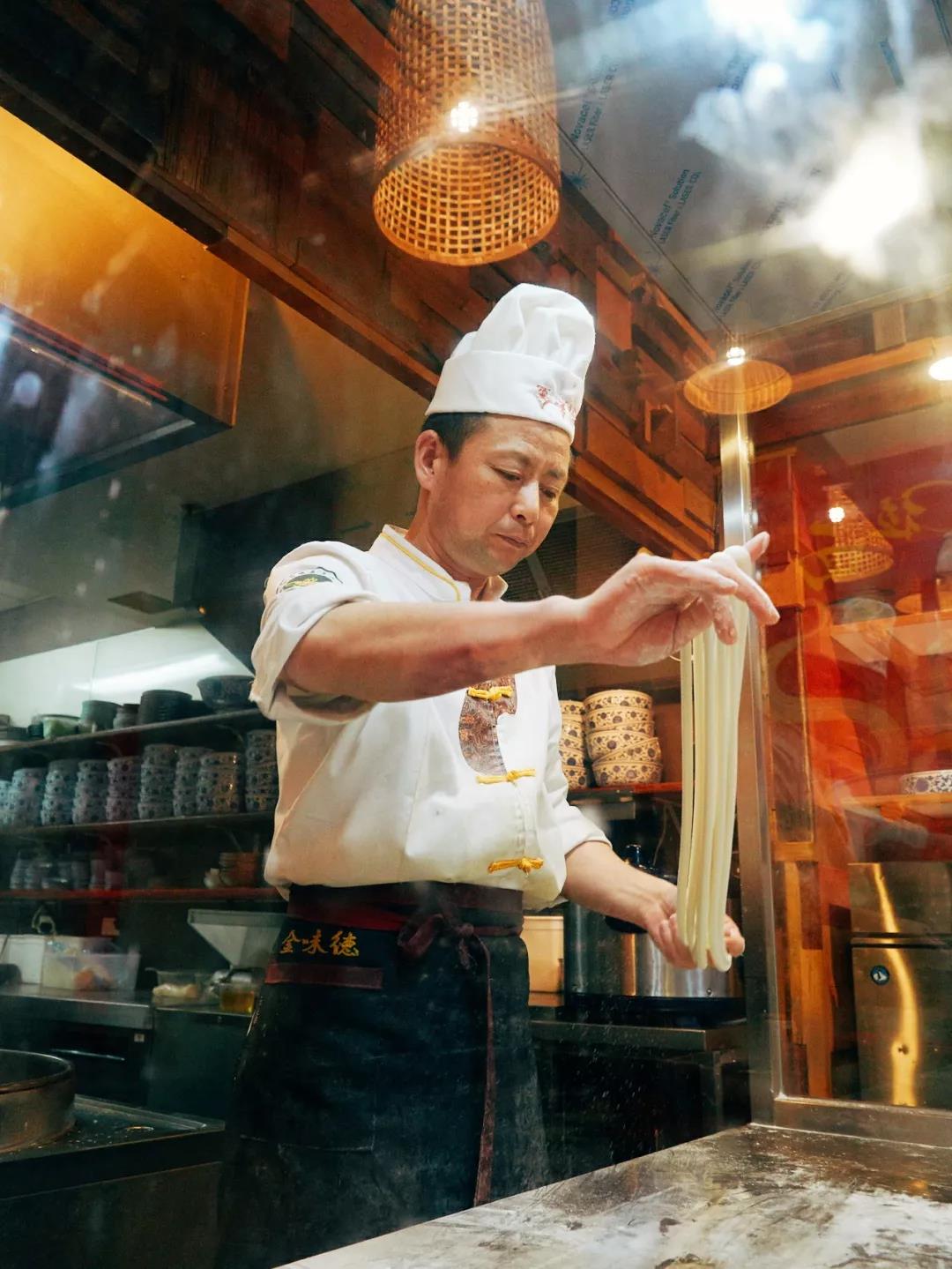 金味德的拉面師傅宛如一位身懷絕技的武林高手,站在開(kāi)放廚房后面,一塊面團(tuán)經(jīng)過(guò)搗、揉、抻、拉、摔、摜等手法,只消片刻功夫,變得柔韌綿長(zhǎng)、粗細(xì)均勻,讓人嘖嘖稱贊!