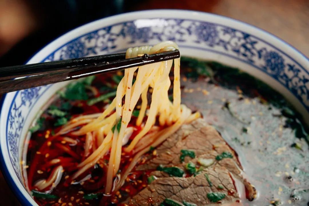 用筷子挑起一簇面條,柔滑透黃,大片牛肉蓋在面上,鮮嫩軟爛。