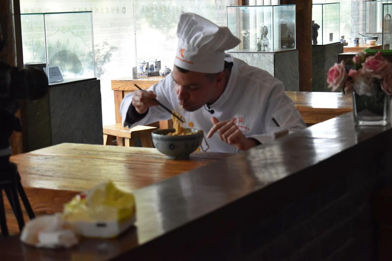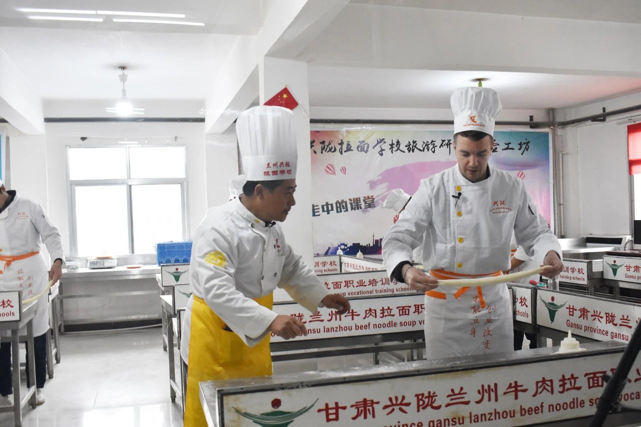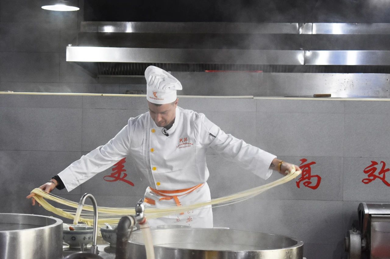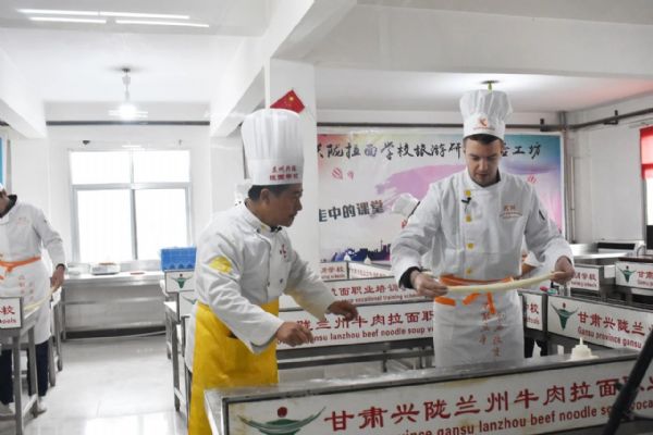 當(dāng)日上午,司徒建國(guó)和團(tuán)隊(duì)首先來(lái)到金味德旗下的甘肅興隴蘭州牛肉拉面職業(yè)培訓(xùn)學(xué)校。他穿上廚師服,戴上廚師帽,走進(jìn)培訓(xùn)室學(xué)拉面。學(xué)校的周老師一邊給他講解拉面技術(shù),一邊進(jìn)行拉面展示。司徒建國(guó)認(rèn)真地看著,英俊的臉上充滿了驚奇。只見(jiàn)他細(xì)長(zhǎng)的胳膊握著溜好的面條,慢慢地向兩端抻拉,面條變長(zhǎng),兩頭對(duì)折時(shí),發(fā)生“意外”。司徒建國(guó)不知道放到左手的什么位置,頓時(shí)慌了神。經(jīng)過(guò)周老師不斷的指導(dǎo),他才勉強(qiáng)完成所有環(huán)節(jié),拉好的面顯得“與眾不同”。培訓(xùn)室里還有其他學(xué)員練習(xí)拉面,司徒建國(guó)和他們互動(dòng)。趙大爺是“大齡”學(xué)員,司徒建國(guó)用一口標(biāo)準(zhǔn)的普通話提問(wèn)趙大爺,“您哪里人?”“您為啥來(lái)學(xué)拉面?”趙大爺熱情地一一回答。攝制團(tuán)隊(duì)一絲不茍地拍下整個(gè)過(guò)程。下午,攝制團(tuán)隊(duì)又來(lái)到金味德蘭州牛肉拉面體驗(yàn)工坊拍攝。司徒建國(guó)時(shí)而品嘗牛肉面,時(shí)而講解牛肉面文化,忙得不亦樂(lè)乎。而后,他親自下廚做了一碗牛肉面。兩相對(duì)比,更體現(xiàn)出金味德牛肉面的專業(yè)、精湛、可口。經(jīng)過(guò)不斷的講解、多次的拍攝,司徒建國(guó)和他的團(tuán)隊(duì)終于完成了攝制任務(wù)。“蘭州牛肉面真好吃,蘭州牛肉面文化博大精深,我會(huì)好好宣傳蘭州牛肉面,讓更多人來(lái)品嘗,喜歡上蘭州牛肉面!彼就浇▏(guó)伸著大拇指堅(jiān)定地說(shuō)到。