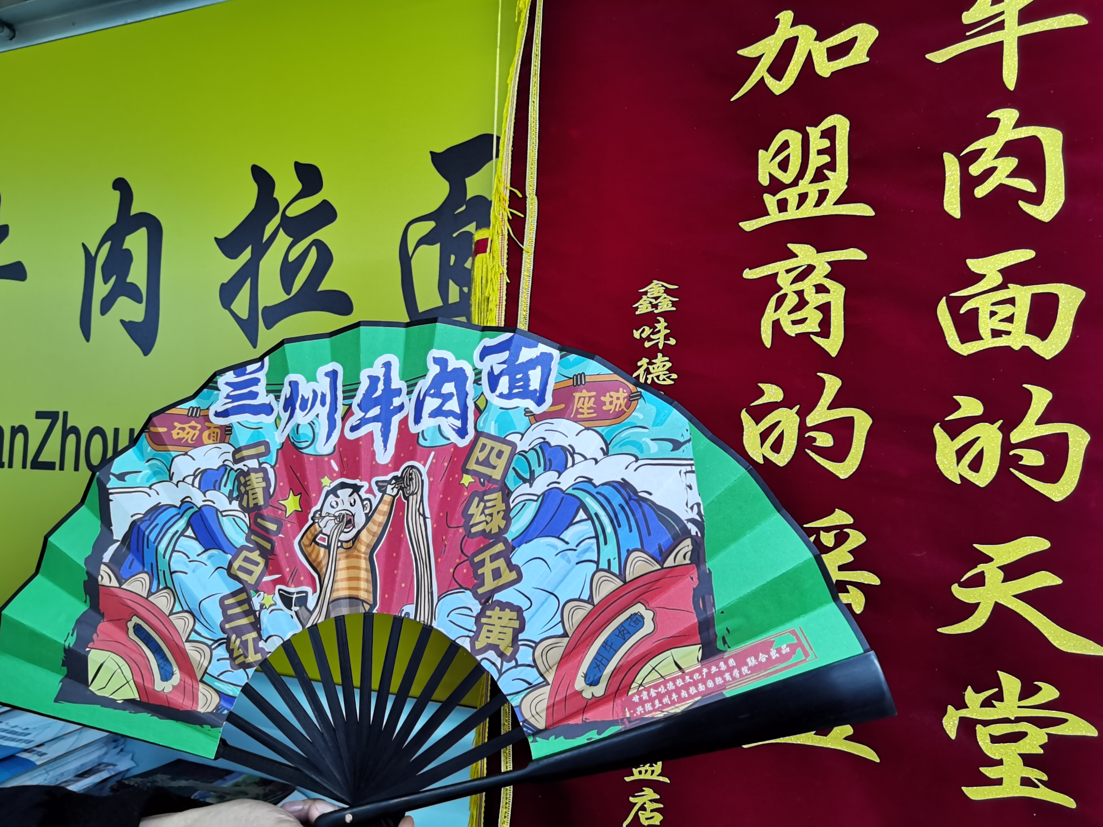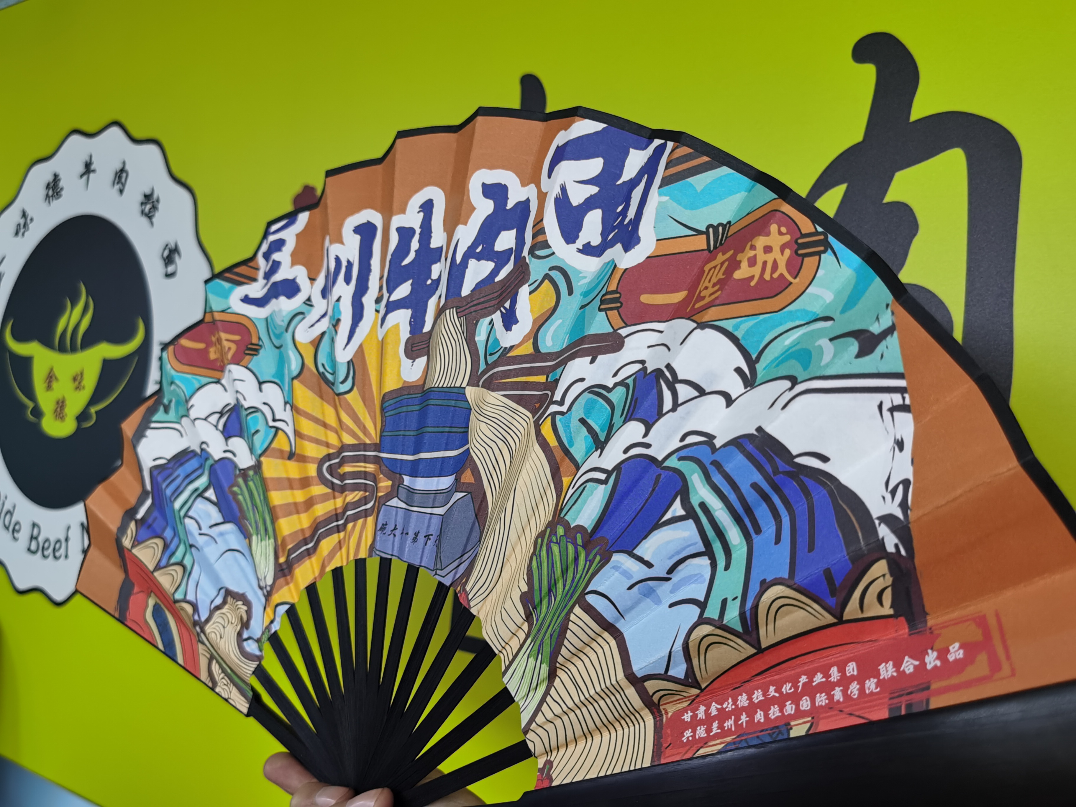 為推廣蘭州牛肉拉面,董事長梁順儉給馮鞏老師贈送了由甘肅金味德拉面文化產(chǎn)業(yè)集團和興隴蘭州拉面國際商學院聯(lián)合出品的蘭州拉面文創(chuàng)產(chǎn)品——扇子,馮鞏老師在蘭州登臺演時出時,手持的就是那一把扇子。