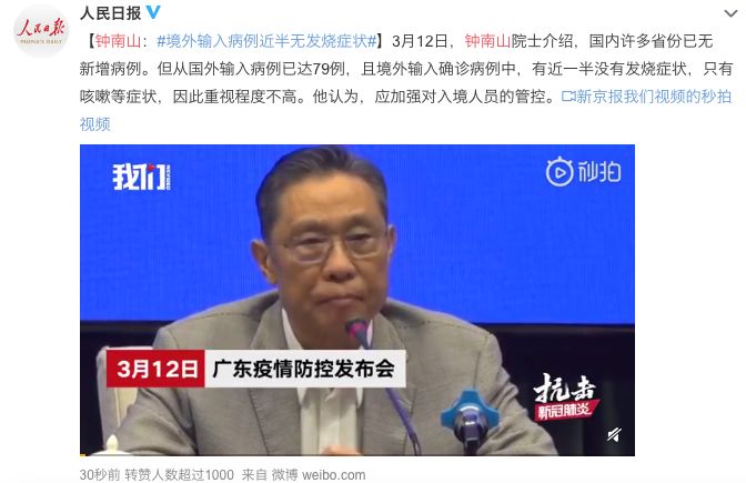 就在今天,鐘南山院士在廣東省疫情防控例行新聞發(fā)布會(huì)再一次強(qiáng)調(diào):國(guó)外輸入病例一半沒有發(fā)燒癥狀,只有咳嗽等癥狀,因此重視程度不高。他認(rèn)為,應(yīng)該加強(qiáng)對(duì)入境人員的管控。