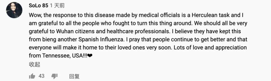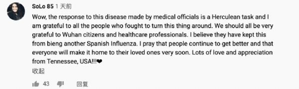 美國網(wǎng)友SoLo 85表示,“一線醫(yī)護(hù)人員們太不容易了,我感謝所有‘戰(zhàn)疫’的人們。祈禱患者趕快好起來,每個人都快點(diǎn)回到親人身邊!
