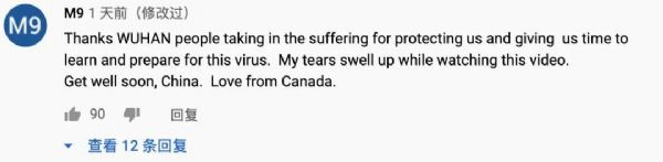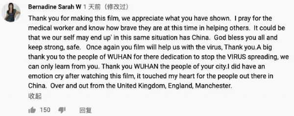 英國網(wǎng)友Bernadine Sarah W評論:“感謝這部紀(jì)錄片,它為我們提供了抗擊疫情的寶貴經(jīng)驗。非常感謝武漢人民用他們的獻身精神阻止了病毒進一步傳播。我們應(yīng)該向他們學(xué)習(xí)。感謝武漢人民!