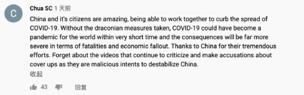 “中國和中國人民真的很棒,能夠團結(jié)起來防控疫情。如果不采取嚴(yán)厲的措施,新冠肺炎可能在很短的時間內(nèi)成為世界性流行病,死亡人數(shù)和經(jīng)濟損失會更加嚴(yán)重!本W(wǎng)友Chua SC稱贊道。