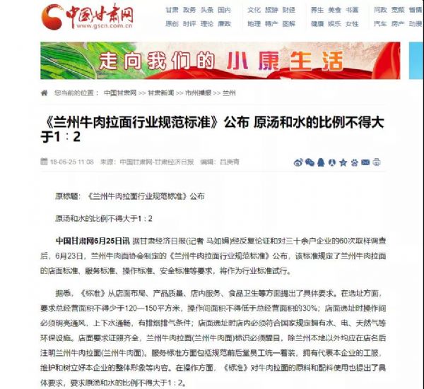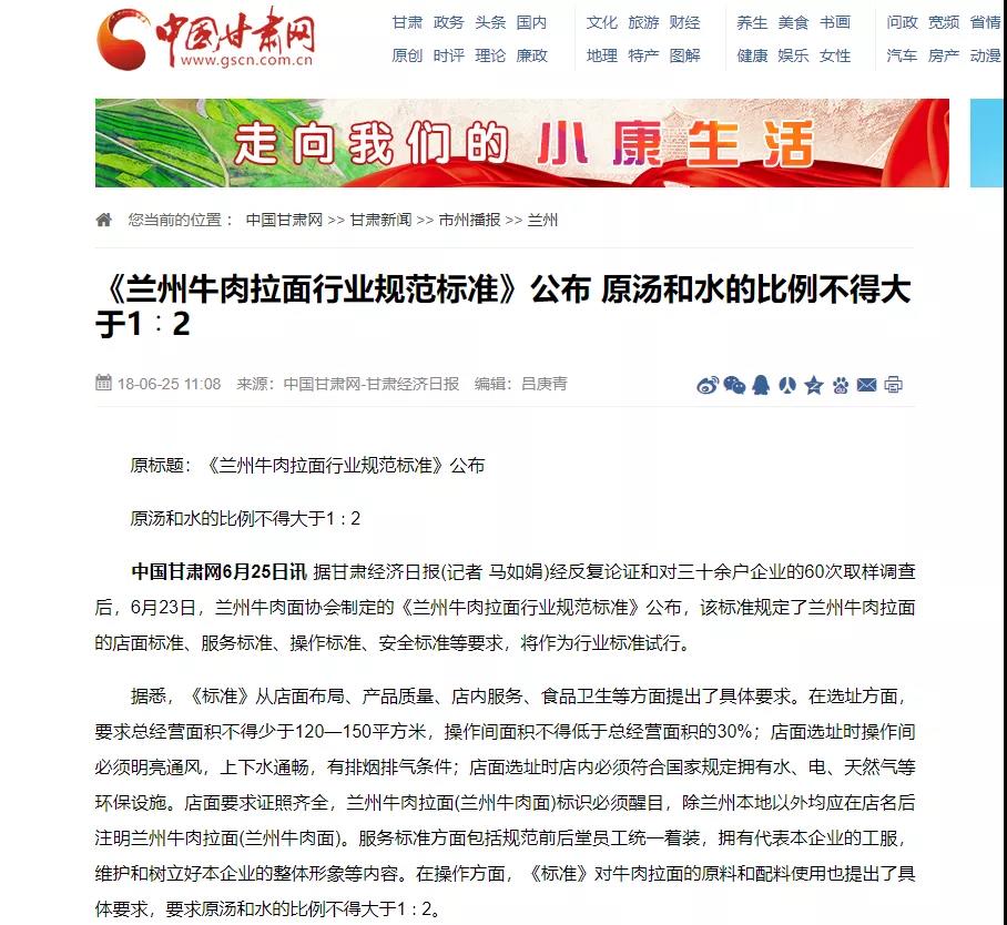 2018年6月23日,蘭州牛肉面協(xié)會(huì)制定的《蘭州牛肉拉面行業(yè)規(guī)范標(biāo)準(zhǔn)》公布,該標(biāo)準(zhǔn)規(guī)定了蘭州牛肉拉面的店面標(biāo)準(zhǔn)、服務(wù)標(biāo)準(zhǔn)、操作標(biāo)準(zhǔn)、安全標(biāo)準(zhǔn)等要求,將作為行業(yè)標(biāo)準(zhǔn)試行。